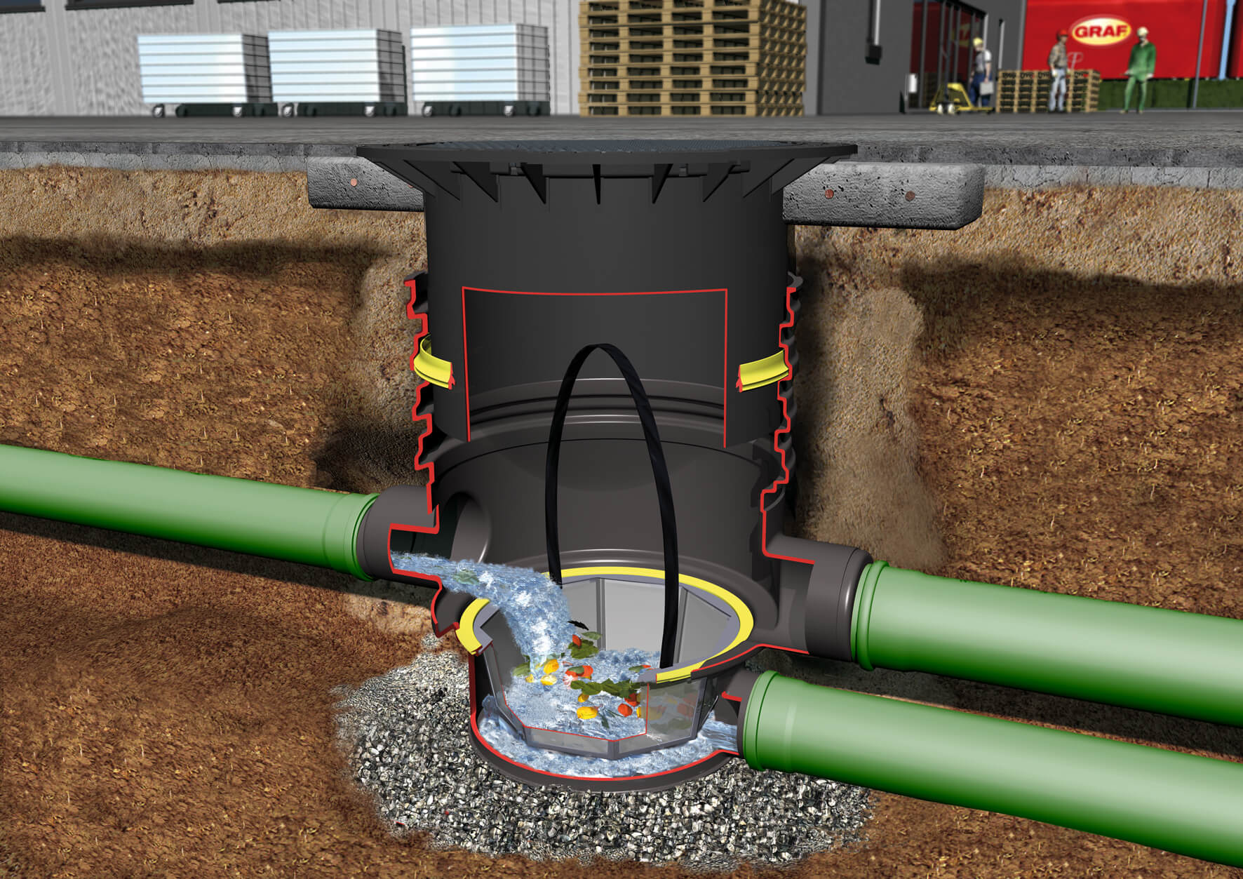Description: A smaller-scale component but critical to green infrastructure, the drainage strainer and collector unit ensures leaves, debris, and sediments are filtered from rainwater systems before entering storage.
